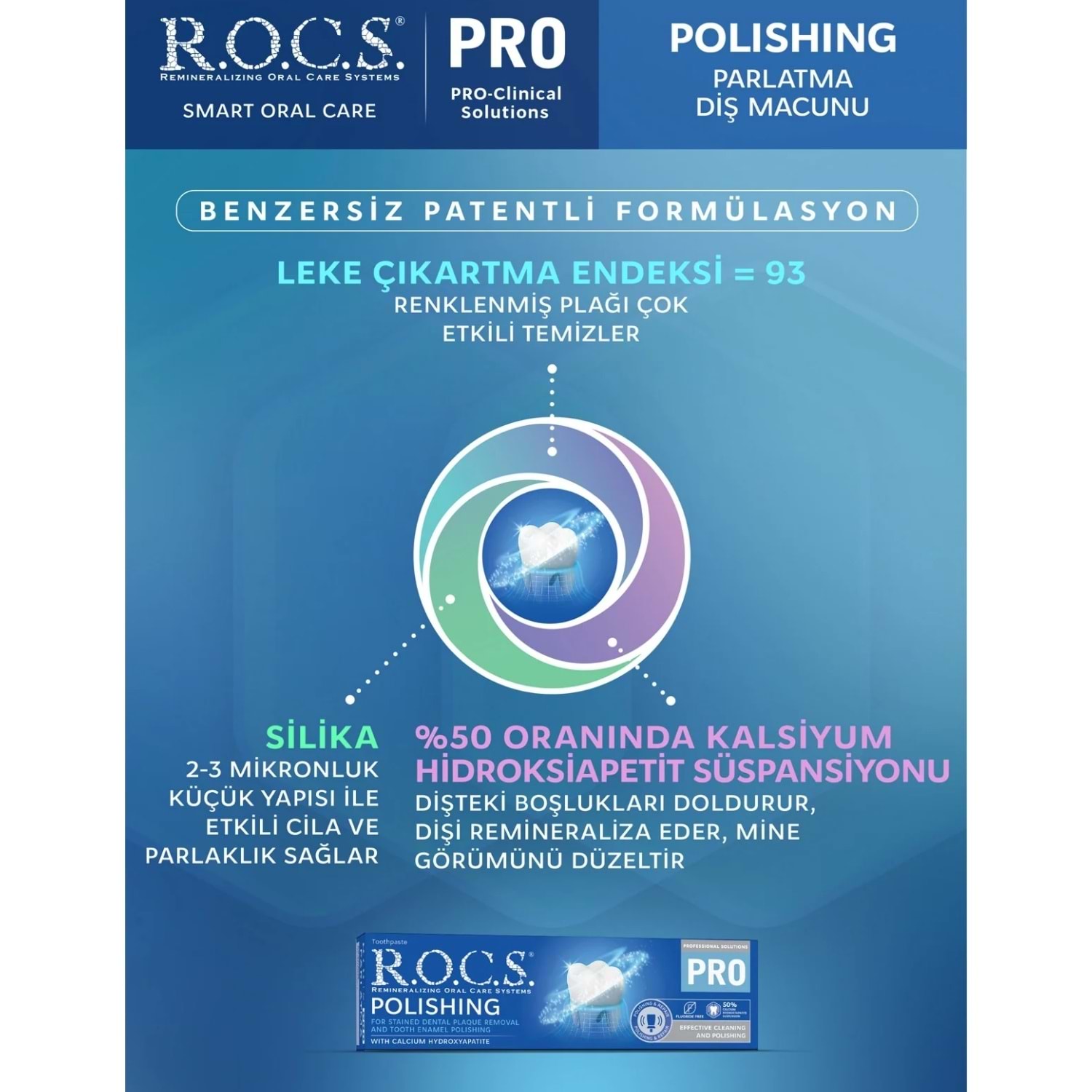 Diş minesine ışıltılı beyazlık ve ayna parlaklığı kazandırmak için geliştirilen özel formülü ile R.O.C.S. PRO Polishing Parlatıcı Cila Macunu, dişlerinizi etkili beyazlatmaya, cilalamaya ve parlatmaya yardımcıdır. Renklenmiş plağı güçlü bir şekilde temizlemeye yardımcı 2-3 mikron boyutunda mini silikon dioksit tanecikler dişleri cilalar ve parlatır. Mineraller ile diş minesini besler ve destekler. Diş minesinin yapı taşı hidroksiapetit ile yüzeydeki küçük çatlak ve delikleri örtebilir, diş minesini pürüzsüz gösterir. Ürünün leke çıkartma endeksi 93 olarak ölçülmüştür. Doğal melisa tadındadır.
